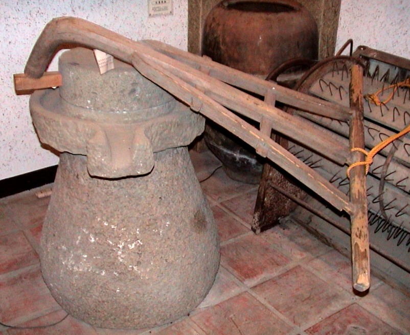石磨是台灣磨米做年粿的特殊工具。去殼的米須先泡在水裹一段時間,然後用石磨來研磨,約三分米一分水。磨米的時候通常由兩種圓形的石頭,中間由一個軸當活準,使上面的石頭轉動,米和水從石頭的上面一個圓洞進出,經研磨後流進下面石頭周圍的糟,然後流經一處漏斗的缺口進入容器,磨好的流質用米袋裝起,用石塊輕壓,下敷稻草灰以便吸水,然後送進籠床(即蒸籠)去炊。年粿到此方大功告成。